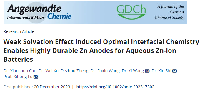 近日,bat365官网材料科学与工程学院王壹教授团队在国际知名期刊《Angewandte chemie international edition》(IF:16.6,中科院1区top期刊)发表题为“Weak Solvation Effect Induced Optimal Interfacial Chemistry Enables Highly Durable Zn Anodes for Aqueous Zn-Ion Batteries”的原创性研究论文。bat365官网王壹教授、中山大学卢锡洪教授和石鑫博士为共同通讯作者,bat365在线中国登录入口为第一单位。