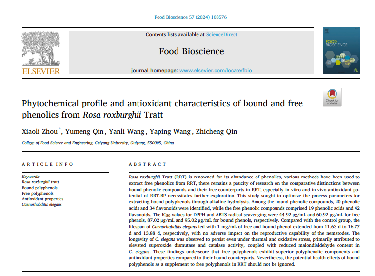 近日,bat365官网食品科学与工程学院周笑犁教授团队在国际知名期刊《Food Bioscience》发表题为“Phytochemical profile and antioxidant characteristics of bound and free phenolics from Rosa roxburghii Tratt”的研究论文。该期刊为中科院1区Top期刊,bat365官网为该研究工作唯一完成单位,周笑犁教授为第一作者及通讯作者。