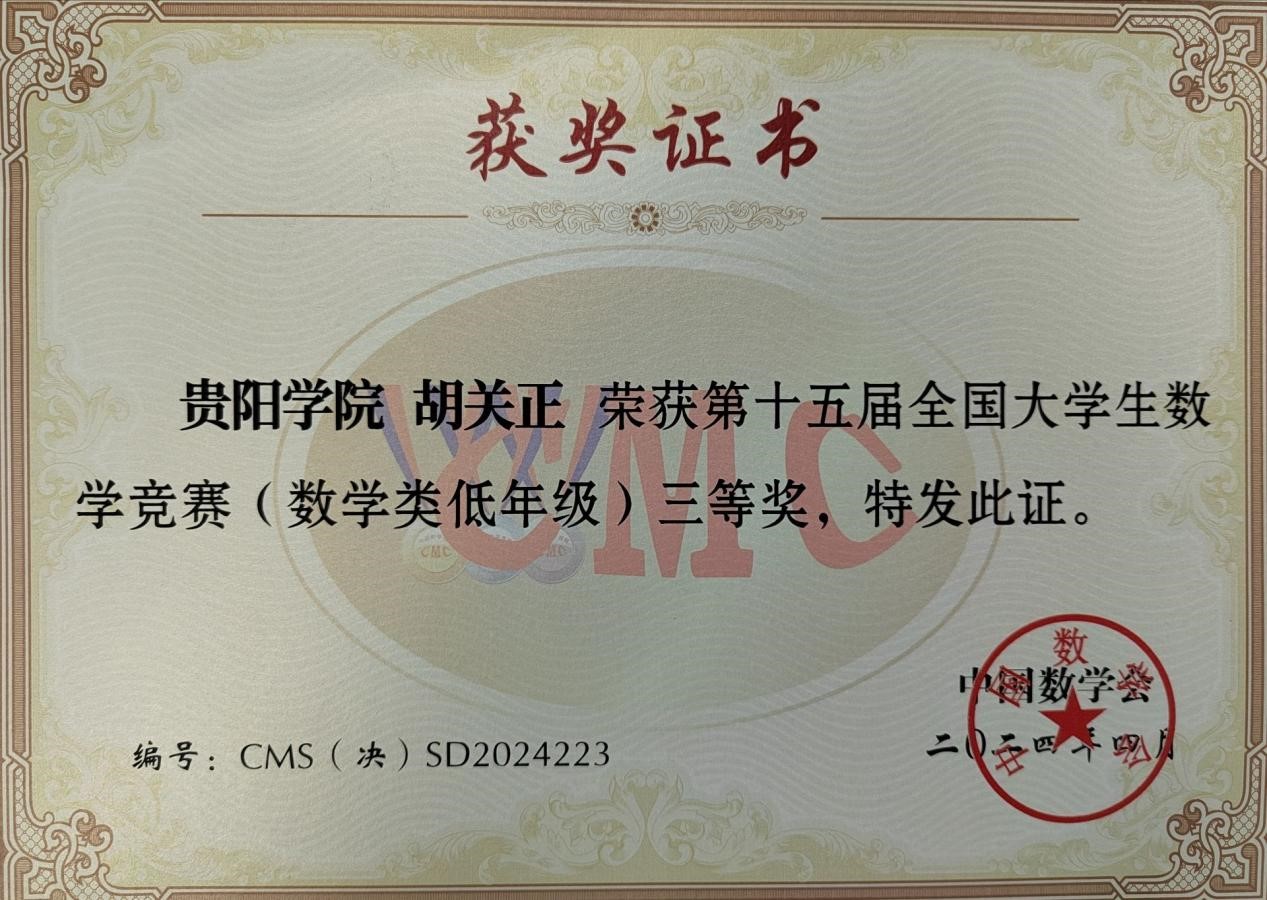 全国大学生数学竞赛是由中国数学会主办,面向本科生的全国性高水平学科竞赛,自2009年起,每年举办一次。本次竞赛决赛全国共有32个赛区288355人报名参加初赛,从中选拔出1169人进入决赛,实际参赛人数1151人,数学专业组583人,非数学专业组568人。决赛分为数学类(高年级组)、数学类(低年级组)和非数学类,共三个赛道。贵州省共有3名同学参加数学类(低年级组)竞赛决赛,其中2名同学获得全国三等奖(贵州大学1名,bat365在线中国登录入口1名)。贵州省共有15名同学参加非数学类竞赛决赛,其中2名同学获得全国二等奖(贵州大学2人),10名同学获得全国三等奖(贵州大学3名,bat365在线中国登录入口1名,贵州财经大学2名,贵州民族大学1名,贵州师范学院1名,贵州商学院1名,遵义师范学院1名)。