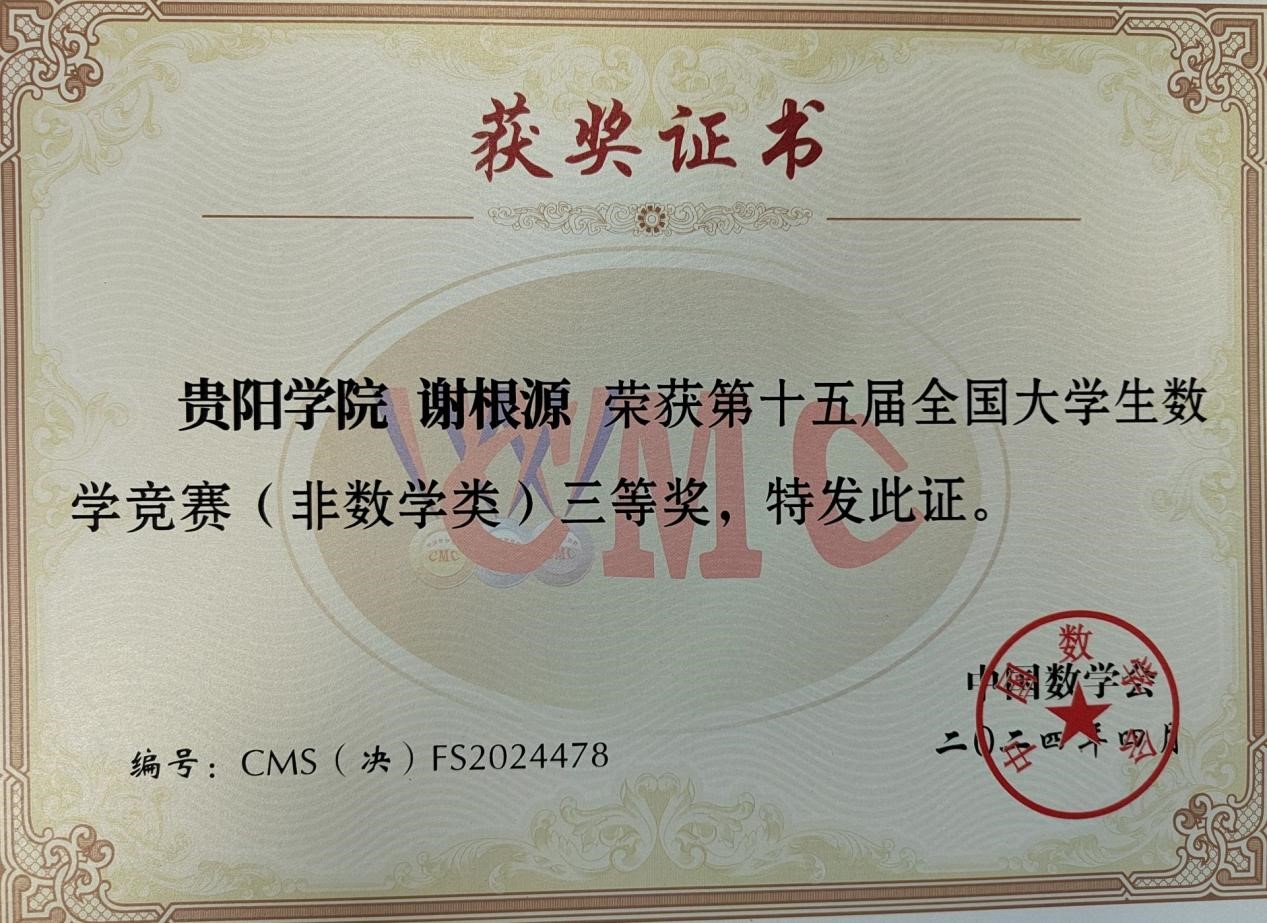 2024年4月19日至21日,第十五届全国大学生数学竞赛决赛在山东大学成功举行。学校理学院2022级数学与应用数学专业学生胡关正在大赛中荣获(数学类低年级)全国三等奖,机械工程学院2020级汽车服务工程专业学生谢根源荣获(非数学类)全国三等奖,学校在此项竞赛决赛中再创佳绩!