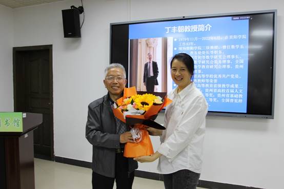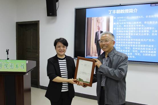 副馆长申西代表图书馆向丁丰朝教授献上鲜花,表达了对他的敬意和感谢。王蜀黔副校长代表学校向丁教授颁发捐赠证书,充分肯定丁教授在教育领域多年耕耘的学术思想成果。