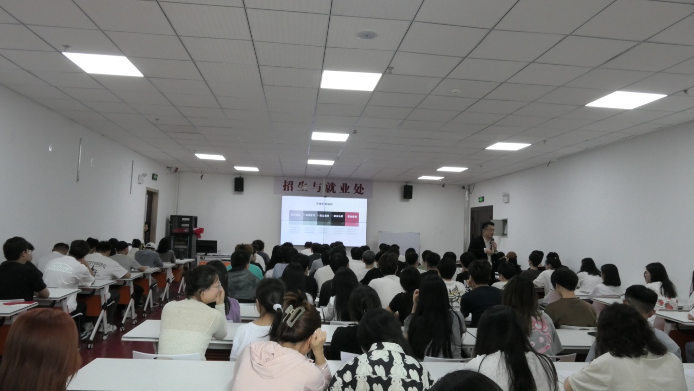 招聘会火热开展的同时,企业宣讲室里正进行着一场就业指导讲座。讲座以“五维职业辅导课”为主题,从简历优化、面试技巧、能力提升、职业认知、职业规划五个方面进行指导,通过重点解说各个方面的注意点,帮助同学们更直观地理解简历制作和面试技巧,并进一步了解如何确立自己的职业目标、找准职业定位、提升个人就业能力。