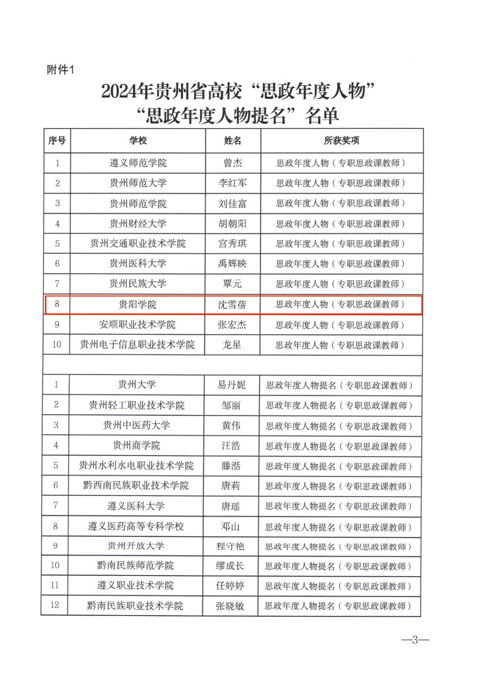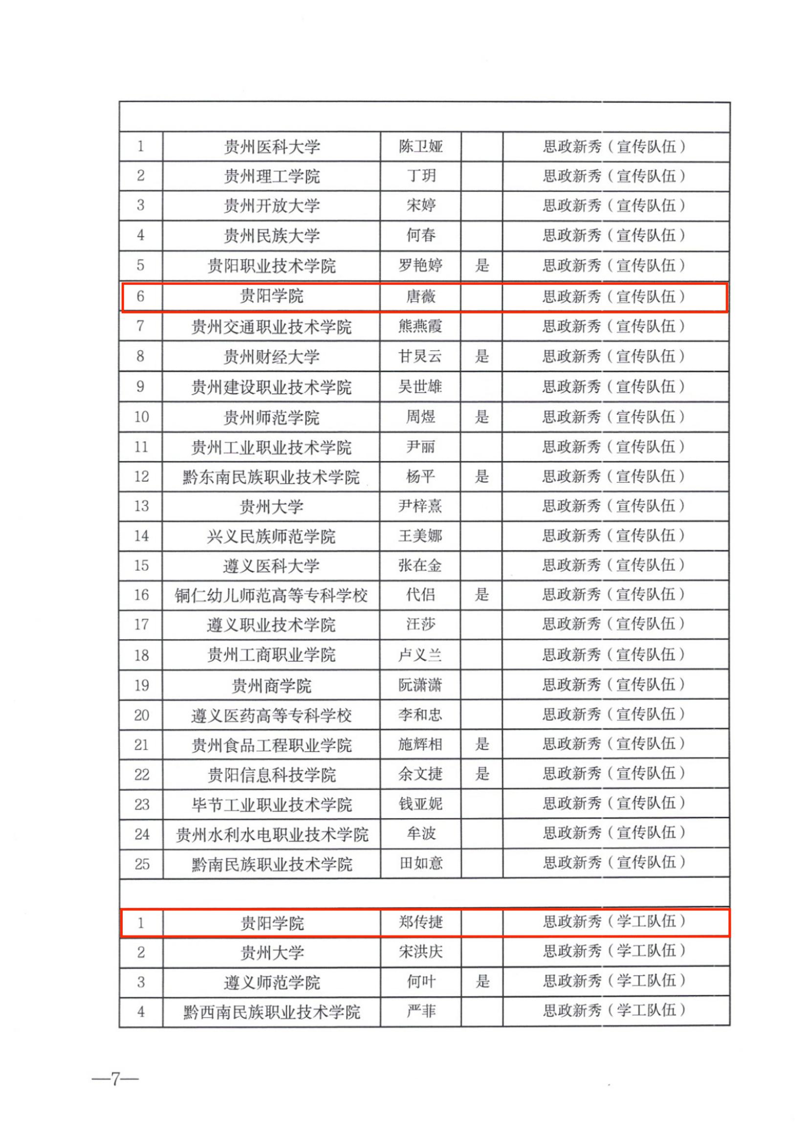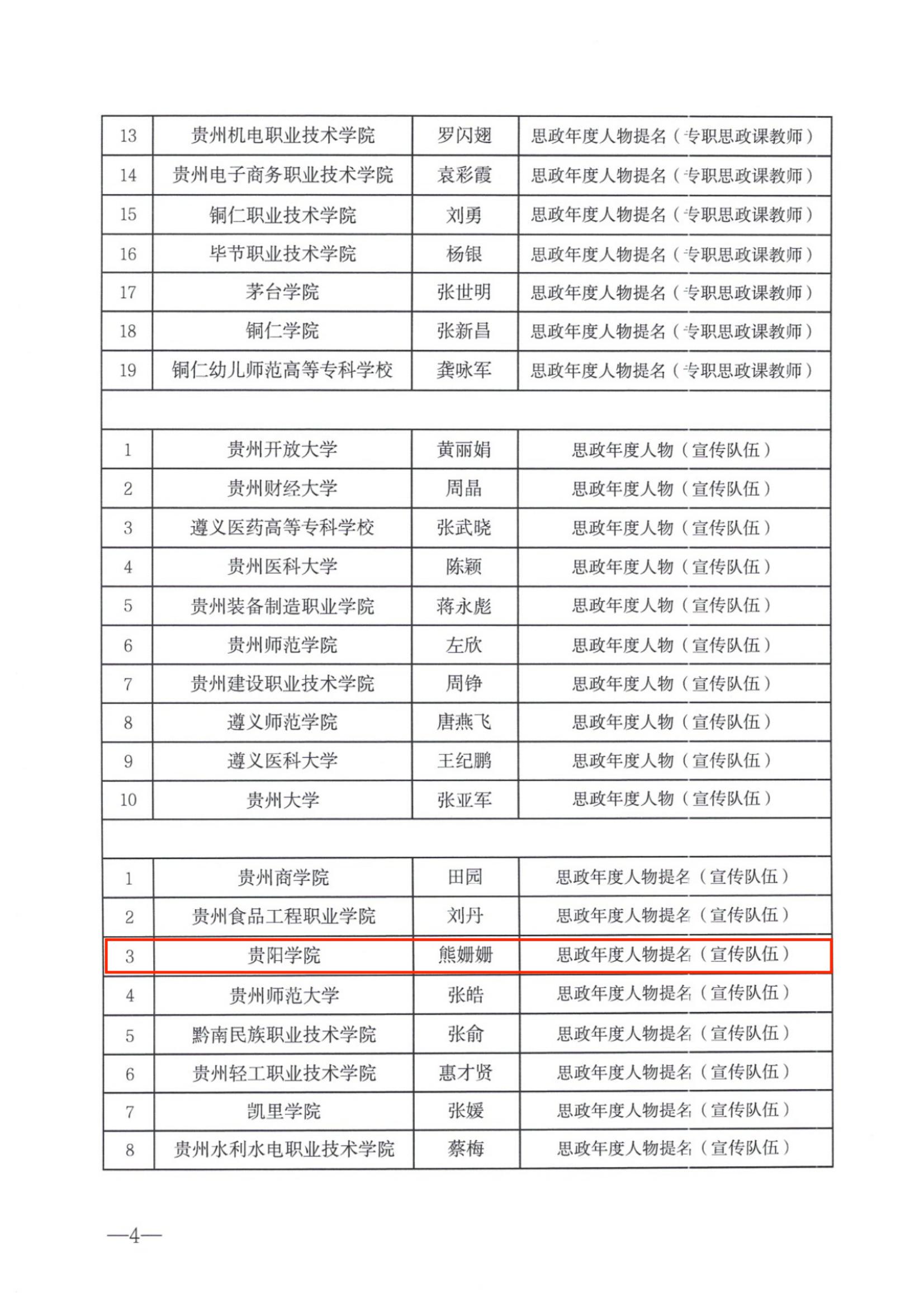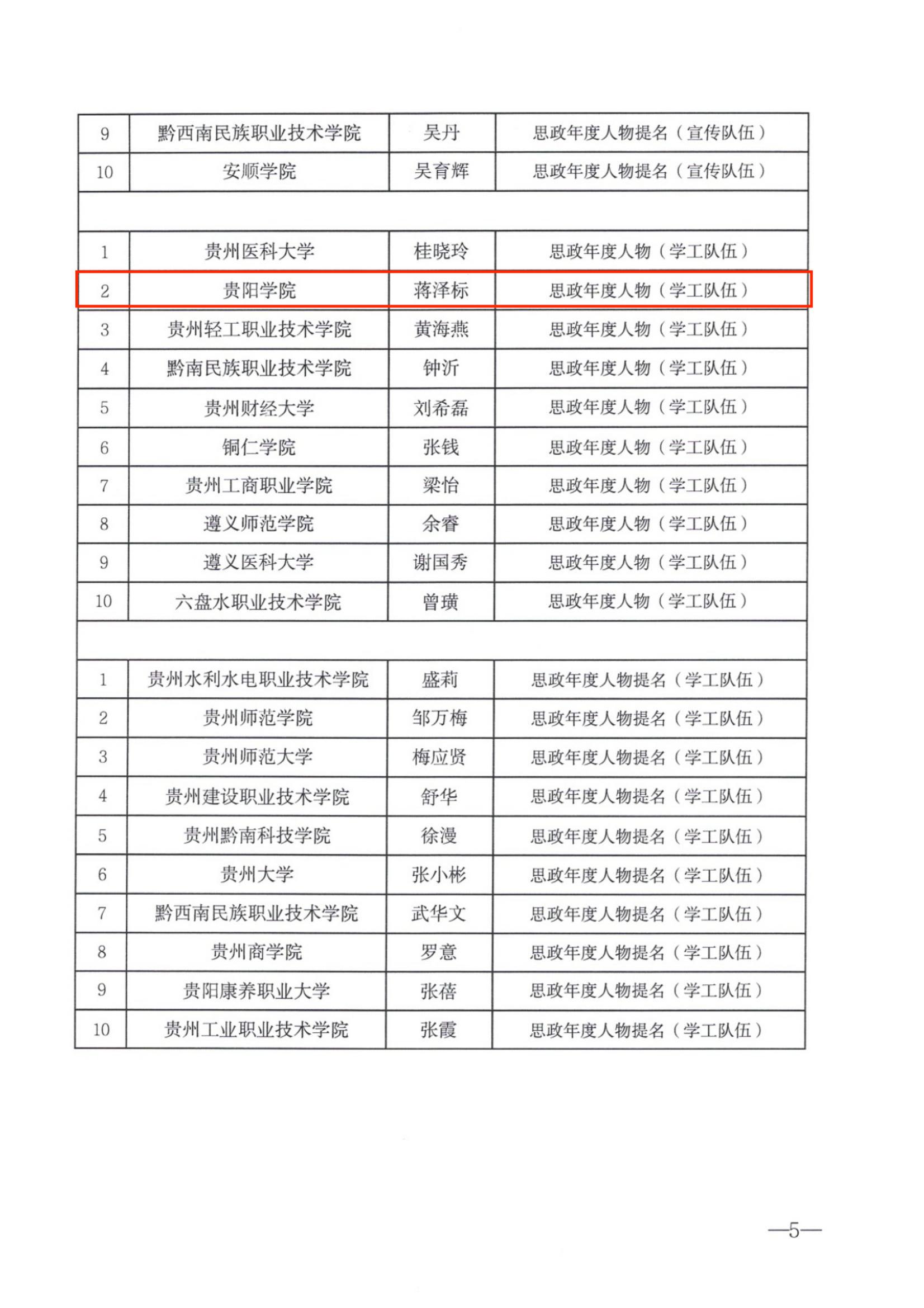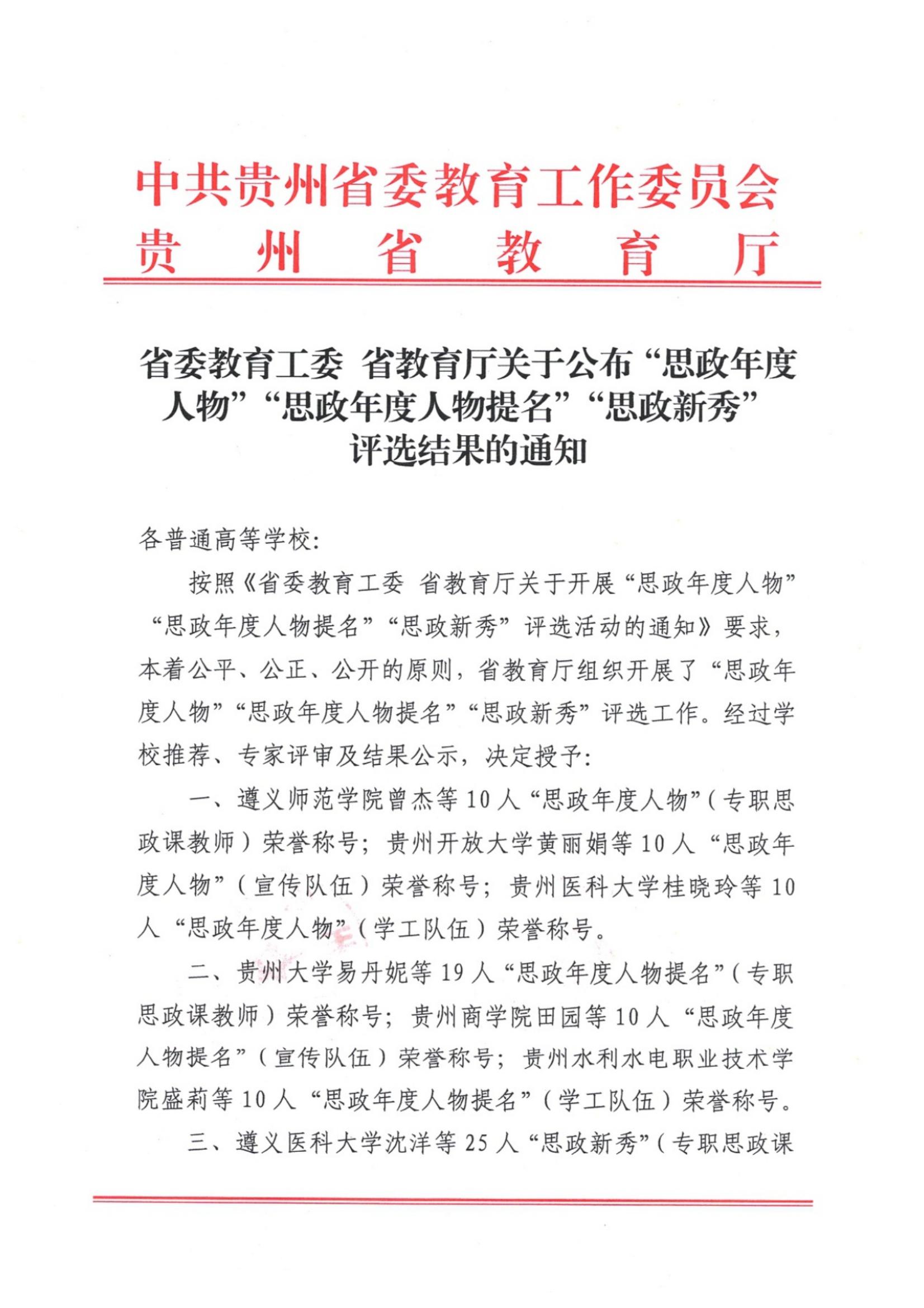近日,省委教育工委、省教育厅正式印发《省委教育工委 省教育厅关于公布“思政年度人物”“思政年度人物提名”“思政新秀”评选结果的通知》,bat365官网沈雪蓓老师获“思政年度人物(专职思政课教师)”、熊姗姗老师获“思政年度人物提名(宣传队伍)”、蒋泽标老师获“思政年度人员(学工队伍)”、唐薇老师获“思政新秀(宣传队伍)”、郑传捷老师获“思政新秀(学工队伍)”。