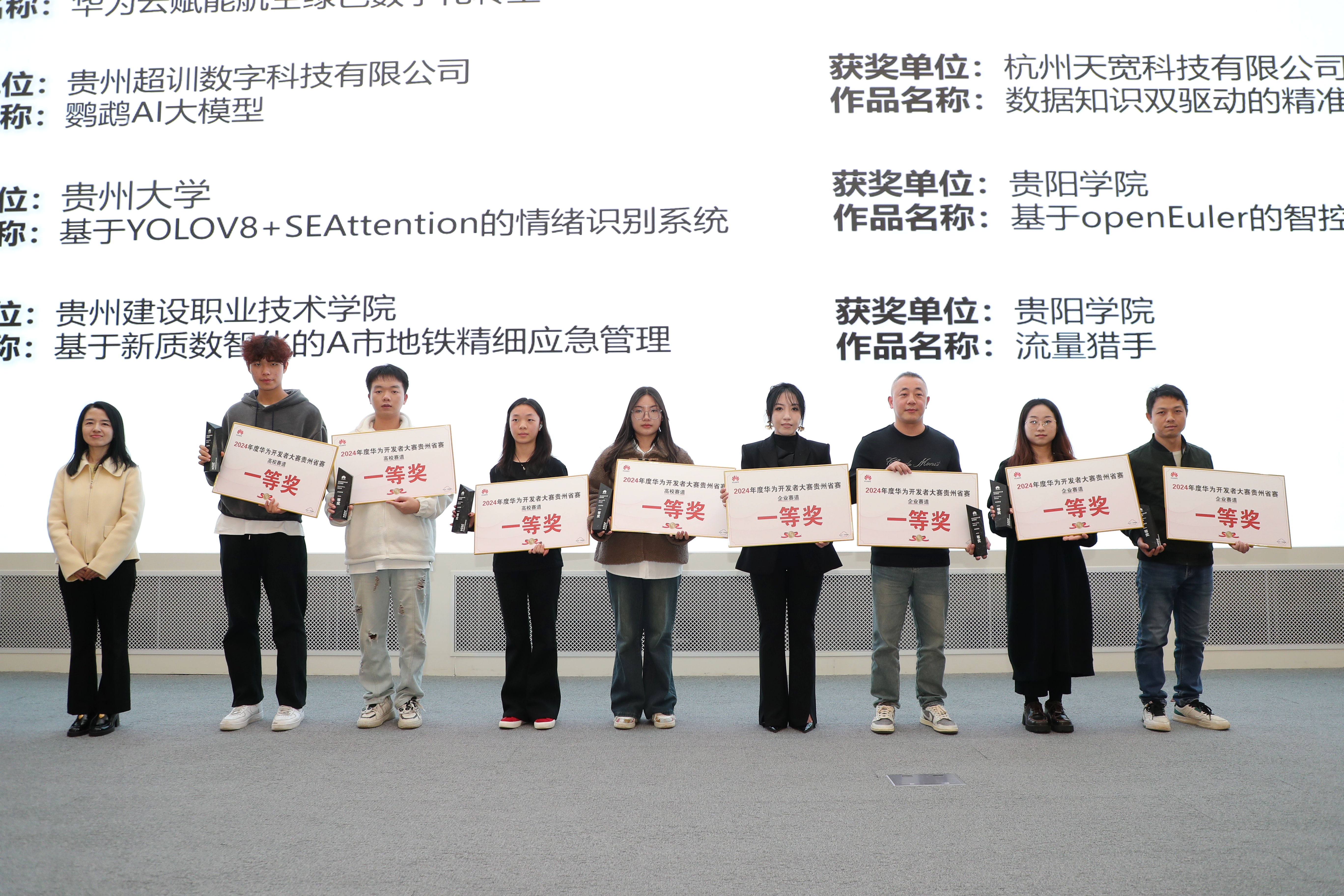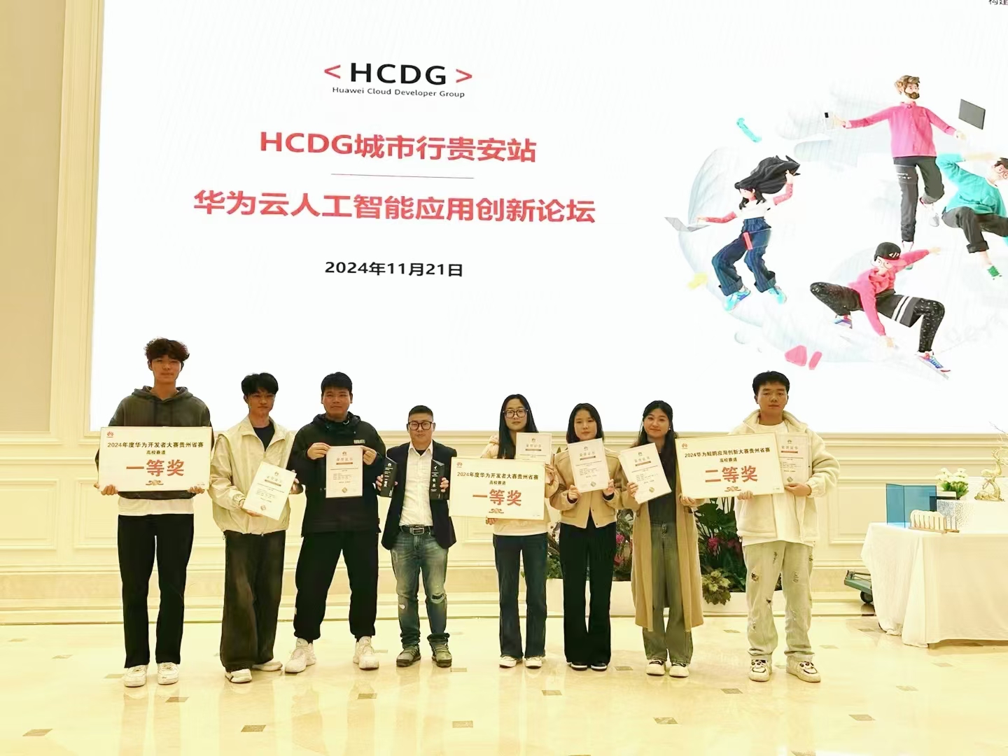 2024年11月21日,在贵阳贵安云上屯举办的2024年华为云人工智能应用创新论坛上,bat365官网代表队在华为开发者大赛激烈的竞争中,凭借卓越的技术实力和创新精神,荣获“华为开发者大赛”高校组省一等奖两项、“2024华为鲲鹏应用创新大赛”高校组赛道省二等奖。
