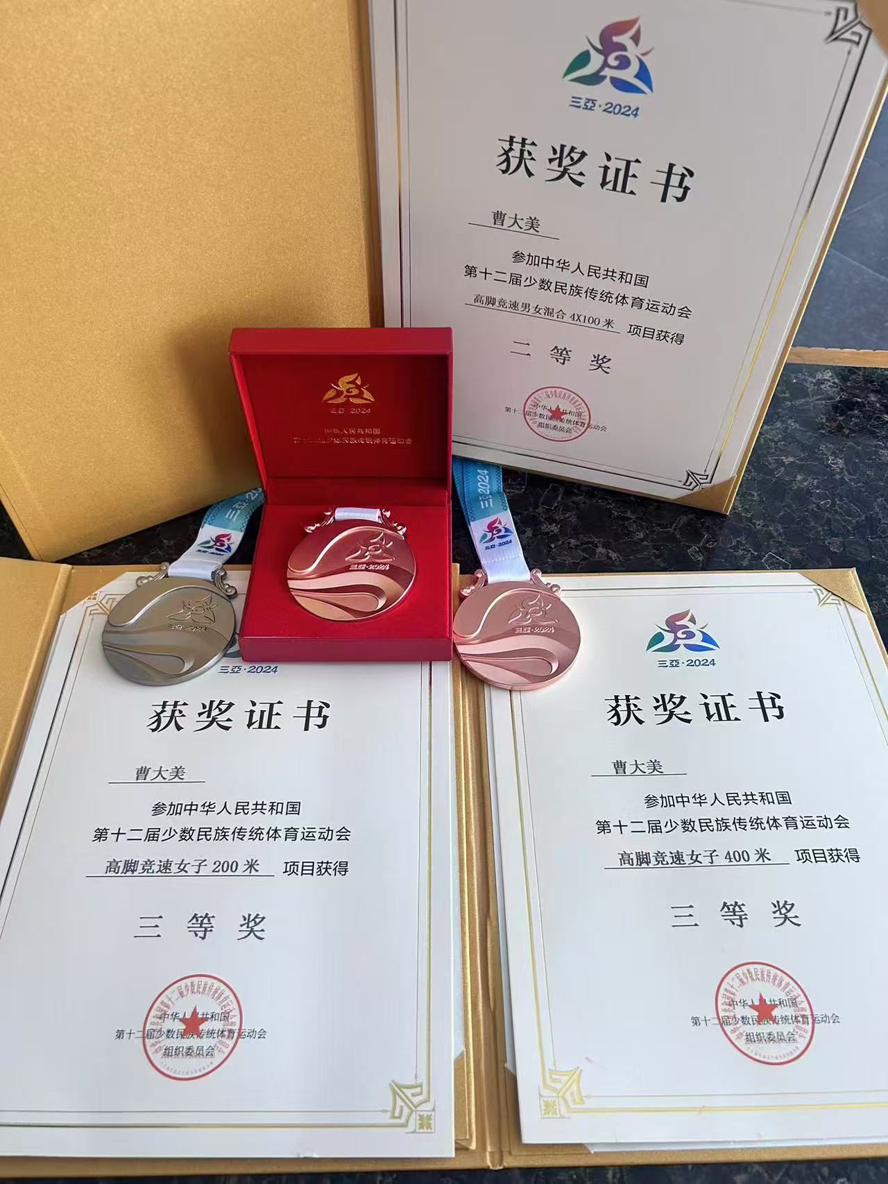 2024年11月23日至29日,第十二届全国少数民族传统体育运动会高脚竞速比赛在海南三亚举行,在比赛中,学校21级体育教育专业学生曹大美为贵州代表团取得混合4X100米接力团体项目二等奖1项、女子200米、女子400米三等奖2项佳绩!