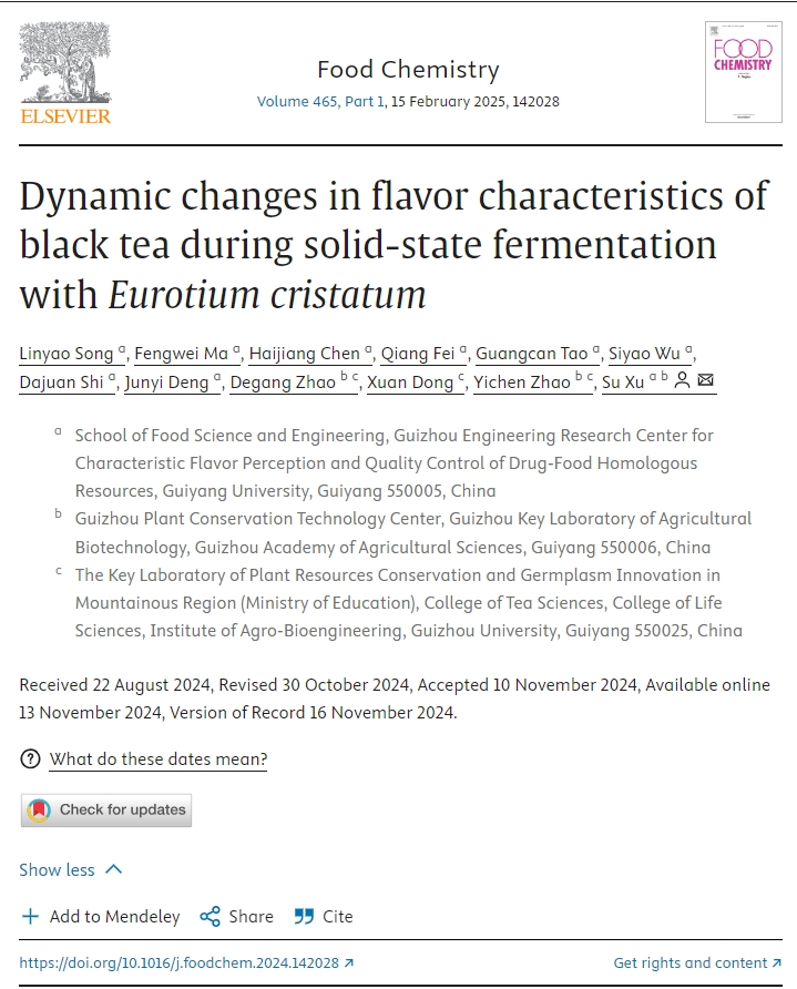 冠突散囊菌(Eurotium cristatum)是茯砖茶发酵过程中的主要优势真菌,对于茯砖茶的香气和滋味有着重要影响。许粟副教授团队研究了单一冠突散囊菌菌种固态发酵红茶过程中红茶风味特征的动态变化,研究发现发酵后红茶的苦涩味显著降低,整体口感得到改善,发酵工艺赋予了红茶独特的花香味和蜂蜜味,提升了红茶的整体风味品质。近日,该成果在国际知名期刊《Food Chemistry》(IF:8.5,中科院1区top期刊)发表,题为“Dynamic changes in flavor characteristics of black tea during solid-state fermentation withEurotium cristatum”。bat365官网2023级生物与医药专业硕士研究生宋林瑶为第一作者,许粟为通讯作者,bat365在线中国登录入口为第一单位。