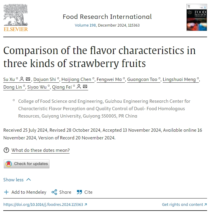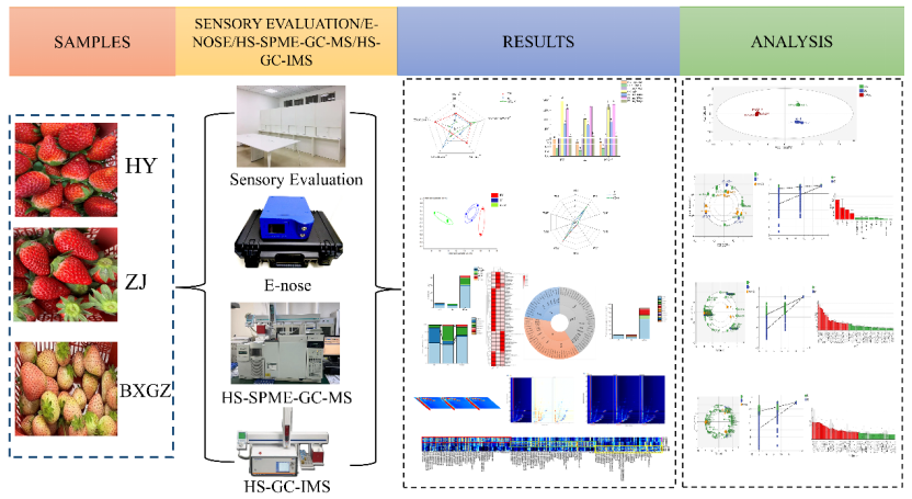 草莓是一种重要的经济作物,各品种在味道、香气和营养价值上存在显著差异。因此,区分和表征不同的草莓品种以评估其品质已成为需要关注的紧迫问题。本研究通过感官评价、理化分析、电子鼻、HS-SPME-GC-MS和HS-GC-IMS评估了三个草莓品种(红颜、章姬、白雪公主)的风味特征。结果表明,章姬草莓甜度最高,而红颜草莓甜度最低。白雪公主草莓的维C、总酚和黄酮类化合物浓度最高。此外,在红颜、章姬和白雪公主草莓中分别鉴定出18、30和33种香气活性值(OAV)大于1的挥发性有机化合物。根据偏最小二乘判别分析(PLS-DA)的结果,3个理化指标、使用HS-SPME-GC-MS检测到的18种挥发性有机物和使用HS-GC-IMS检测到的26种挥发性有机物被确定为潜在的生物标志物。这些发现为草莓品种之间风味差异的鉴别提供了有价值的见解,并建立了一种使用GC-IMS快速分析草莓果实香气的方法。该成果近日在在国际知名期刊《Food Research International》(IF:7.0,中科院1区top期刊)发表,题为“Comparison of the flavor characteristics in three kinds of strawberry fruits”。学校副教授许粟为第一作者,2023级生物与医药专业硕士研究生史大娟为第二作者,副教授许粟、费强为共同通讯作者,bat365在线中国登录入口为唯一单位。
