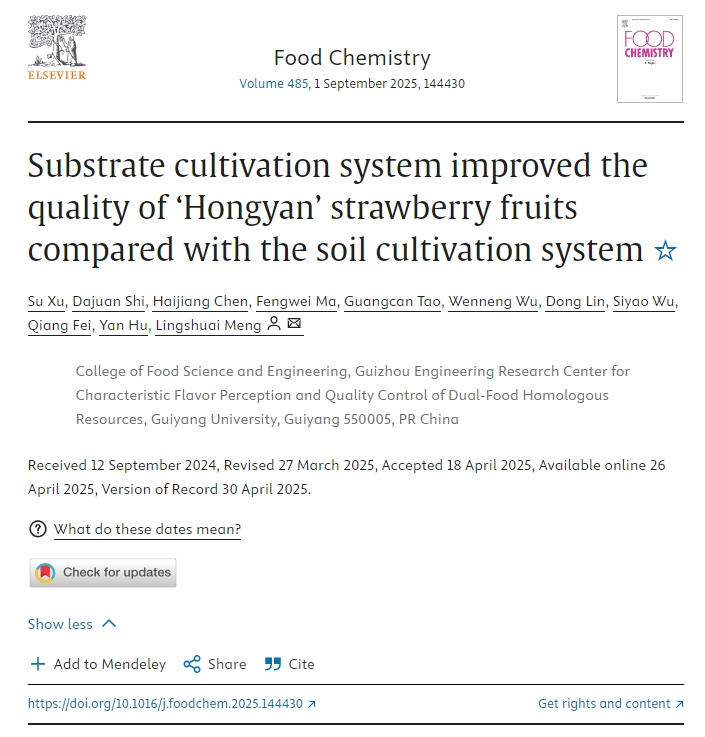 近日,学校食品科学与工程学院许粟副教授团队在国际知名期刊《Food Chemistry》(IF:9.8,中科院1区top期刊)发表题为“Substrate cultivation system improved the quality of ‘Hongyan’ strawberry fruits compared with the soil cultivation system”的原创性研究论文。许粟副教授为第一作者,学校2022级生物与医药专业硕士研究生史大娟为第二作者,孟令帅副教授为通讯作者,bat365在线中国登录入口为第一单位。