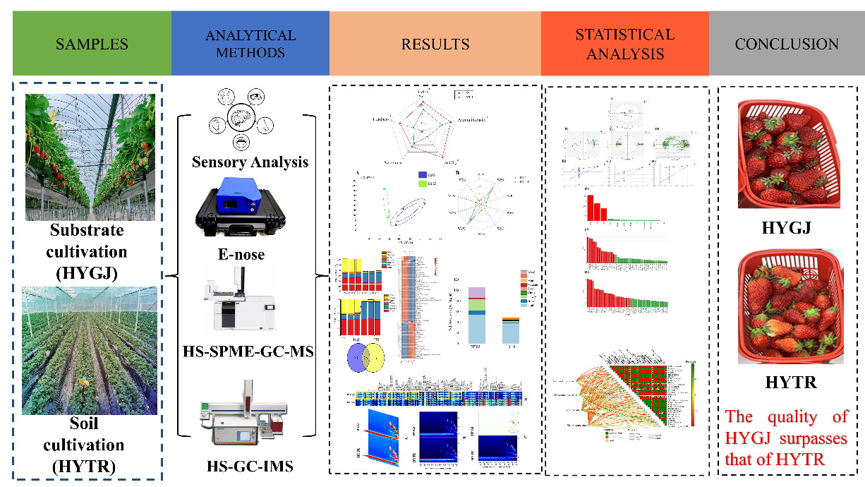 本研究通过理化及感官评价,以及电子鼻、GC-MS和GC-IMS分析,探究了基质栽培系统对‘红颜’草莓品质的影响。结果表明,基质栽培系统显著促进了草莓中总酸、维生素C、总酚以及酯类、醇类和酸类等挥发性化合物的形成。此外,它还提高了果实的硬度、酸度、香气强度和色泽。挥发性有机化合物(VOCs)的ROAV分析表明,基质栽培系统促进了绿色、花香、柑橘和木质香味的呈现,同时也引入了独特的焦糖和薄荷风味。通过VIP值分析,三个关键的理化参数和几种重要的挥发性酯类、醇类和醛类被确定为区分基质栽培系统和土壤栽培系统种植草莓的重要生物标志物。相关性分析揭示了挥发性有机化合物(VOCs)之间的显著关系,特别是酯类、醛类和醇类,以及环境温度、基质温度、施肥频率与理化性质和特征性挥发性有机化合物(VOCs)之间的显著正相关性。