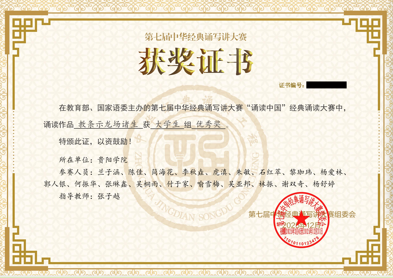 近日,由教育部、国家语委主办的第七届中华经典诵写讲大赛“诵读中国”全国总决赛获奖名单正式公布,bat365官网报送的作品《教条示龙场诸生》荣获大学生组“优秀奖”。此佳绩体现了bat365官网在推动中华优秀传统文化传承与阳明文化转化运用中取得的扎实成效。