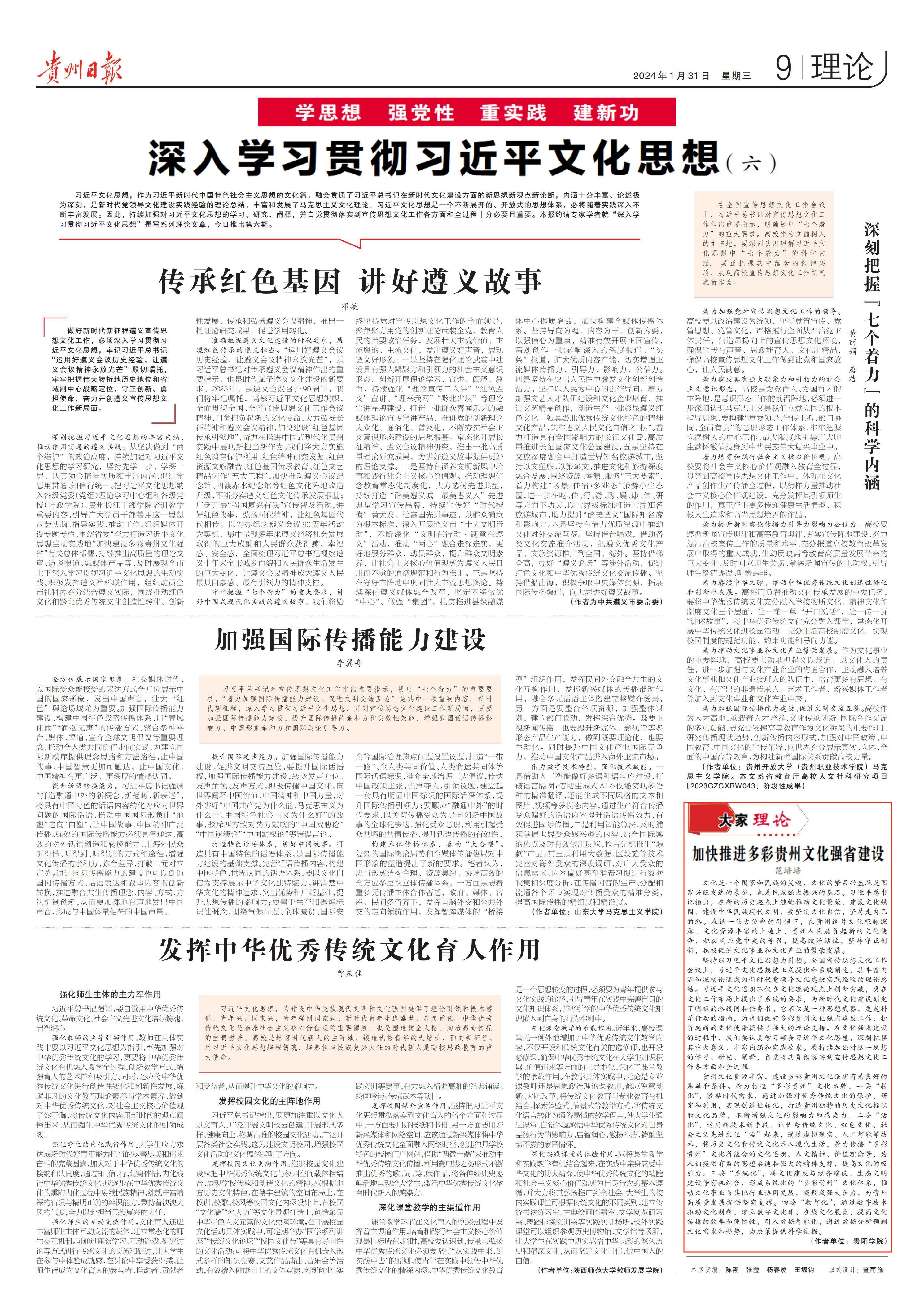 坚持以习近平文化思想为引领。全国宣传思想文化工作会议上,习近平文化思想被正式提出和系统阐述,其丰富内涵和深刻论述成为新时代党领导文化建设实践经验的理论总结。习近平文化思想不仅在文化理论观点上创新突破,更在文化工作布局上提出了系统的要求,为新时代文化建设划定了明确的路线图和任务书。它不仅是一种思想武器,更是科学行动的指南,为我们做好多彩贵州文化强省建设工作、担负起新的文化使命提供了强大的理论支持。在文化强省建设的过程中,我们要认真学习领会习近平文化思想,深刻把握其重大意义、丰富内涵和实践要求。要持续加强对这一思想的学习、研究、阐释,自觉将其贯彻落实到宣传思想文化工作各方面和全过程。