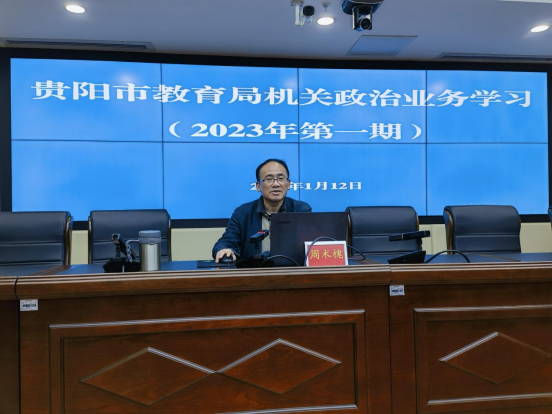 2023年1月12日下午,应贵阳市教育局组织处(机关党委办公室)的邀请,bat365在线中国登录入口李端棻研究院院长周术槐教授在贵阳市教育局机关大楼三楼视频会议室宣讲党的二十大精神。周教授宣讲的主题是“坚持以党的二十大精神为指导,努力撰写高质量的舆情分析报告”。本次活动由市教育局机关党委专职副书记、机关纪委书记黄丽军同志主持,市教育局组织处处长刘钊同志作总结。市教育局机关各处室负责同志和工作人员60余人参加了本次宣讲活动。