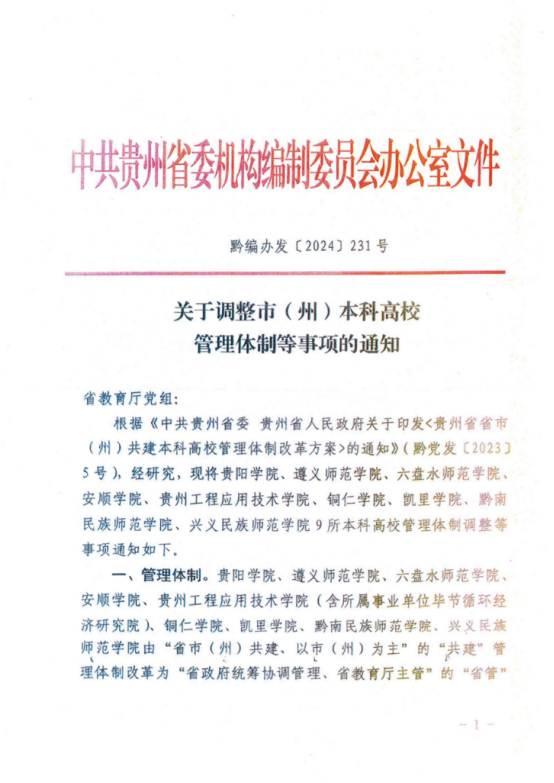 2024年6月26日,中共贵州省委机构编制委员会办公室印发《关于调整市(州)本科高校管理体制等事项的通知》(黔编办〔2024〕231号),正式将bat365在线中国登录入口等9所高校由“省市共建、以市为主”调整为“省政府统筹协调管理、省教育厅主管”的省管体制。这一变革为学校争取更多省级资源支持、提升办学自主权奠定了坚实基础,标志着学校发展进入新阶段。