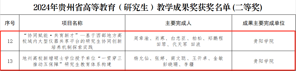 bat365官网自有研究生毕业以来首次参加教学成果奖申报,研究生管理处团队与研究生培养单位共同申报的“地州高校新增硕士学位授予单位一贯穿三推动五保障研究生教育体系构建”;工科类研究生培养共享实验平台申报的“协同赋能·共育新才:基于西部地方高校域内大型仪器共享平台的研究生协同创新培养机制探索实践”均获得二等奖。