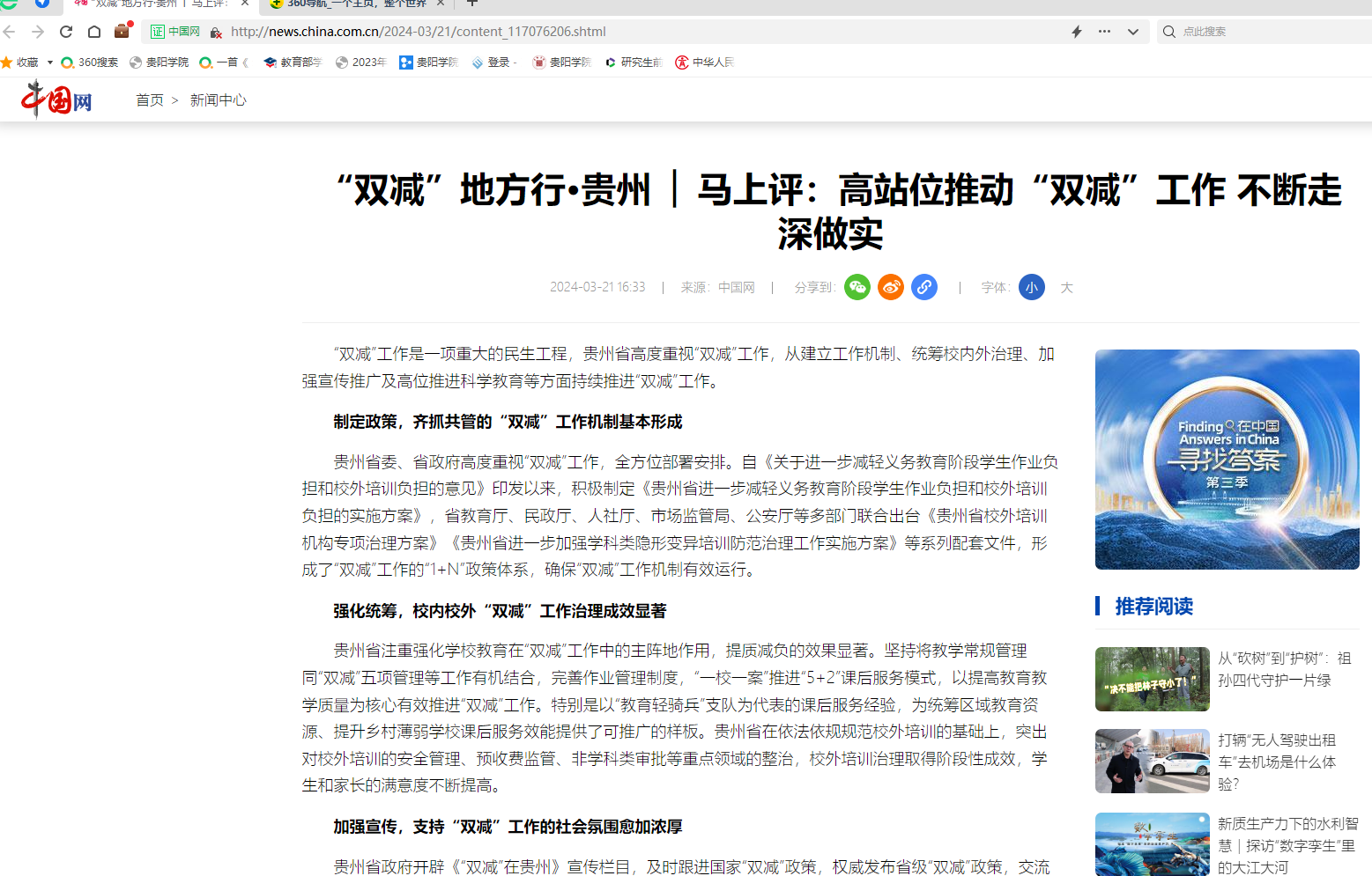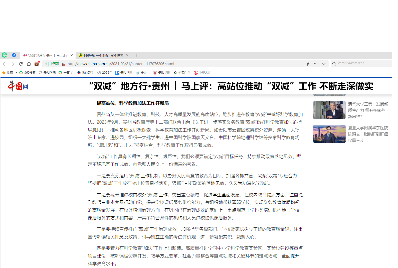 左成光在文章指出,“双减”工作是一项重大的民生工程,贵州省高度重视“双减”工作,从建立工作机制、统筹校内外治理、加强宣传推广及高位推进科学教育等方面持续推进“双减”工作。贵州省从一体化推进教育、科技、人才高质量发展的高度站位,稳步推进在教育“双减”中做好科学教育加法,并对贵州省今后如何在科学教育“加法”工作上出新绩提出了建议,将助力我省贯彻落实教育部等十八部门联合发布《关于加强新时代中小学科学教育工作的意见》及贵州省教育厅等十二部门联合发布《关于进一步落实义务教育“双减”做好科学教育加法的指导意见》等文件。