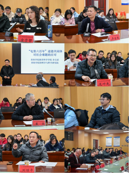 bat365官网师生代表在研讨会上发表了精彩见解。马克思主义学院金崇碧教授为大家分享了中华传统文化从民族性到世界性的融合路径,尤其是阳明心学与马克思主义融合发展的路径和方法,引发了学生思考和追问;教育科学学院余文武教授结合自己完成两个国家课题的经验,通过对安顺屯堡文化的个案研究,揭示了其中潜藏的道德共同体与伦理实践,引起大家对屯堡文化的强烈兴趣;学报编辑部戴岳教授强调了哲学对推动理性和反思的重要价值,指出哲学应当服务于生活,反思提升智慧;阳明学与黔学研究院刘继平教授系统阐述了王阳明对儒家“乐”思想的继承与发展;学报编辑部李金来教授则从文字学角度出发,论证了中国哲学作为“心的哲学”的特质,并以陶渊明的名字陶潜为例,希望同学们激发潜能,做不一样的自己;马克思主义学院龙叶先教授探讨了阳明心学与马克思主义哲学的结合点,回应了关于唯心唯物对立的质疑,认为唯物唯心在不同的文化背景下有不同的含义,不能简单比附;电通学院代天军博士则从物理学、量子力学角度抛出了“量子纠缠”与中国哲学“物”的问题,引起了现场长达十多分钟的热烈讨论,把现场氛围推向高潮。
