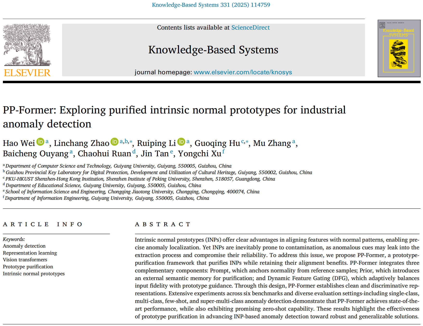 近日,学校计算机科学学院赵林畅团队研究生在国际知名期刊《Knowledge-Based Systems》(中科院1区top期刊,影响因子7.6)发表题为“PP-Former: Exploring purified intrinsic normal prototypes for industrial anomaly detection”的研究论文。团队成员2023级电子信息专业大数据方向硕士研究生魏灏为第一作者,赵林畅为通讯作者,bat365在线中国登录入口为第一单位。