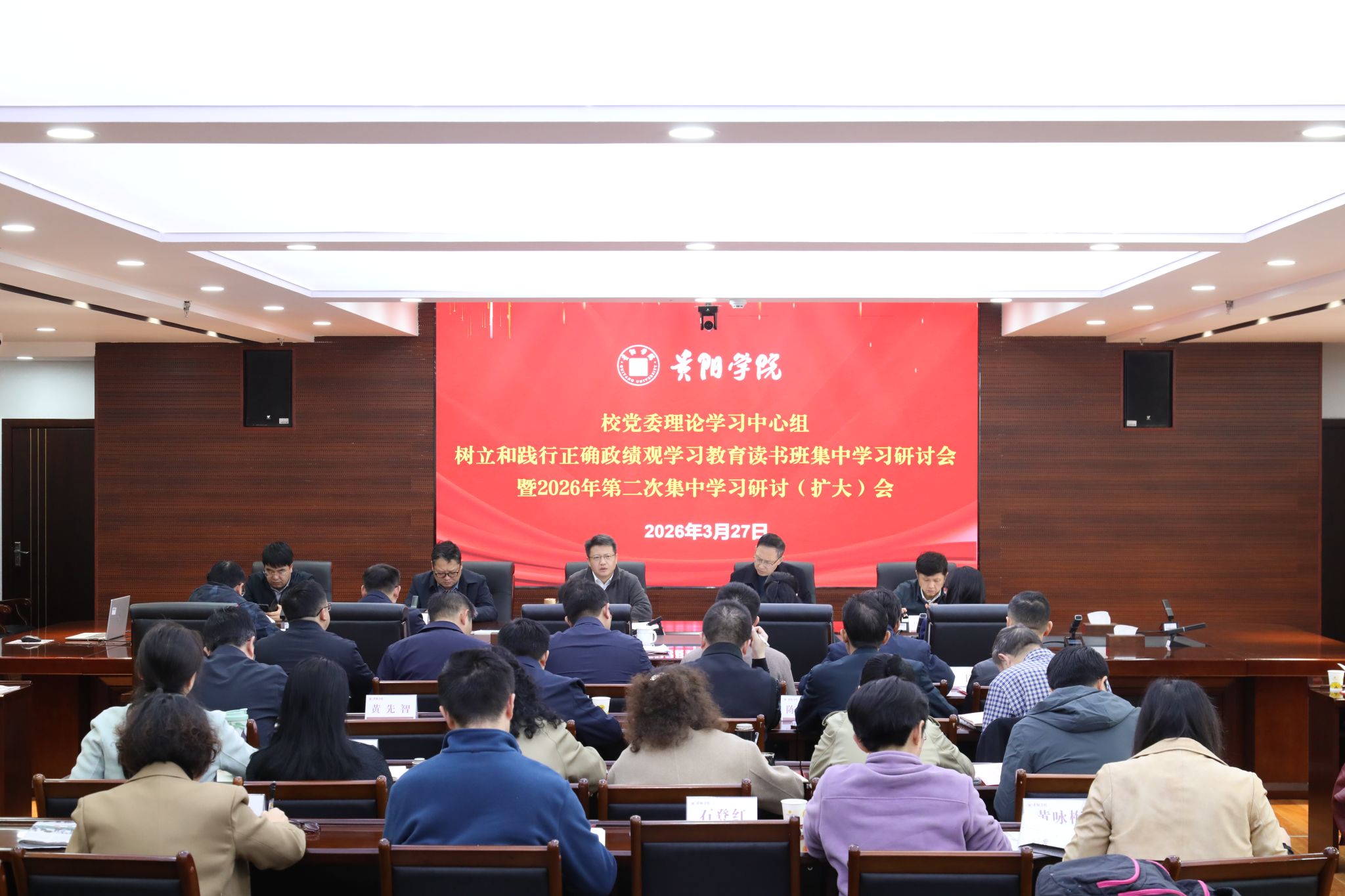 3月27日上午,bat365在线中国登录入口党委理论学习中心组树立和践行正确政绩观学习教育集中研讨会在九思楼八楼会议室举行。校党委书记黄营主持并讲话。